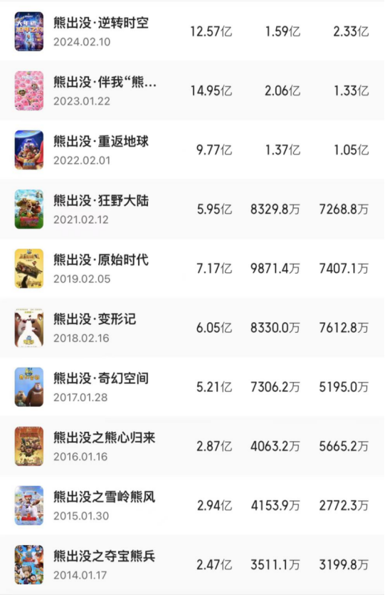 没有人可以永远保持上升叙事。回看十年历程,每年刷新自身纪录的《熊出没》其实也曾遭遇过唱衰时刻。第三部《熊出没之熊心归来》票房比前一年有所下滑,彼时有业内人士指出3亿是《熊出没》系列的天花板。第七部《熊出没·狂野大陆》票房也出现了下滑,又有业内人士认为8亿或者10亿是《熊出没》系列的天花板。