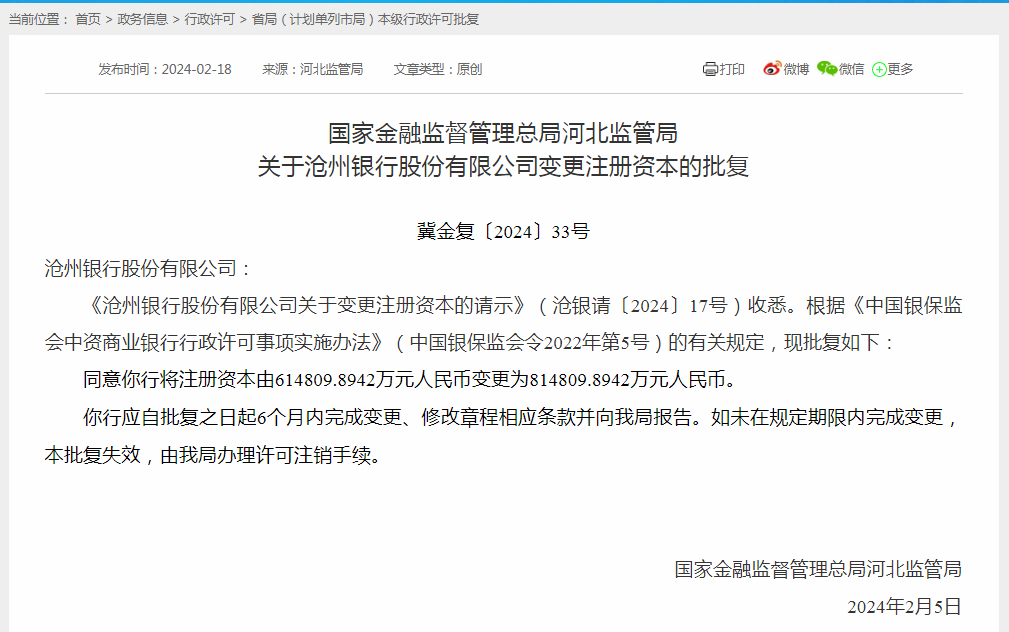 2月18日,国家金融监督管理总局河北监管局官网显示,沧州银行股份有限公司已获批将注册资本由614809.8942万元人民币变更为814809.8942万元人民币。沧州银行应自批复之日起6个月内完成变更、修改章程相应条款并向河北监管局报告。