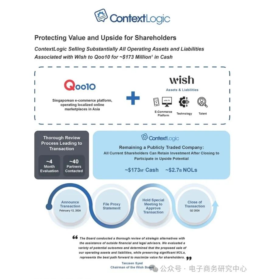 ContextLogic公告显示,董事会已一致批准出售其几乎所有资产。运营资产和负债(主要包括其 Wish 电子商务平台)以约1.73亿美元现金转让给Qoo10,此次收购价格约为每股6.50美元,较ContextLogic在 2024 年 2 月 9 日(宣布交易前的最后一个交易日)的收盘价溢价约 44%。