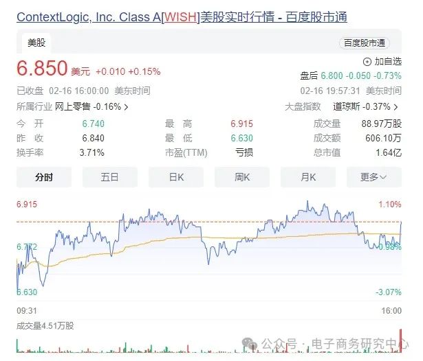 然而,截至美东时间2月16日收盘,ContextLogic股价为6.85美元,市值为1.64亿美元,较最高峰时期,ContextLogic市值已缩水99%。