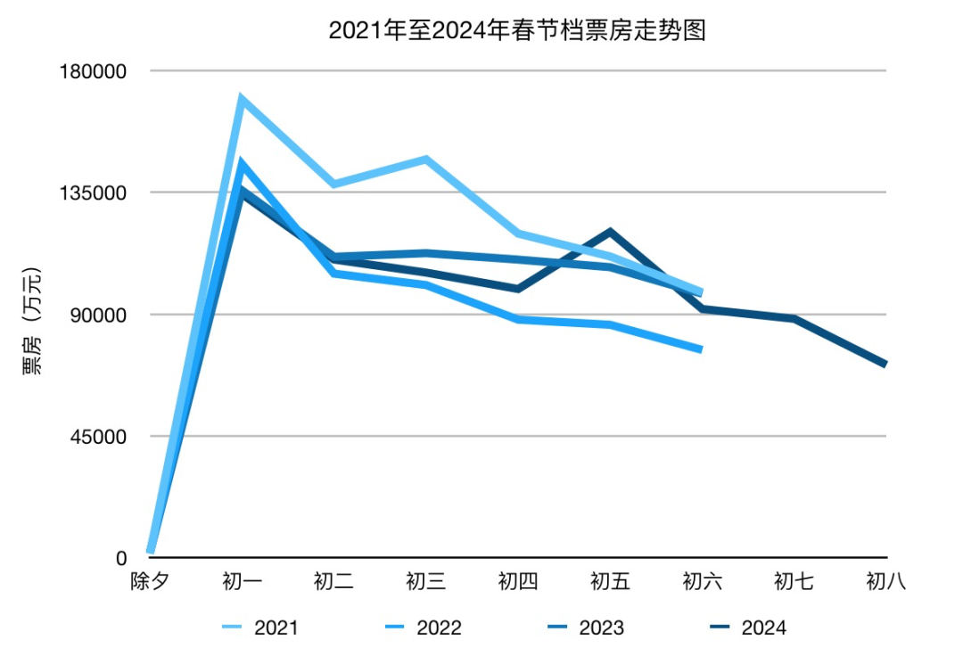 对照当年的票房数据,事实也确实是如此。除了情人节将单日票房拉到了12亿,初一到初六的日均票房均低于2023年。
