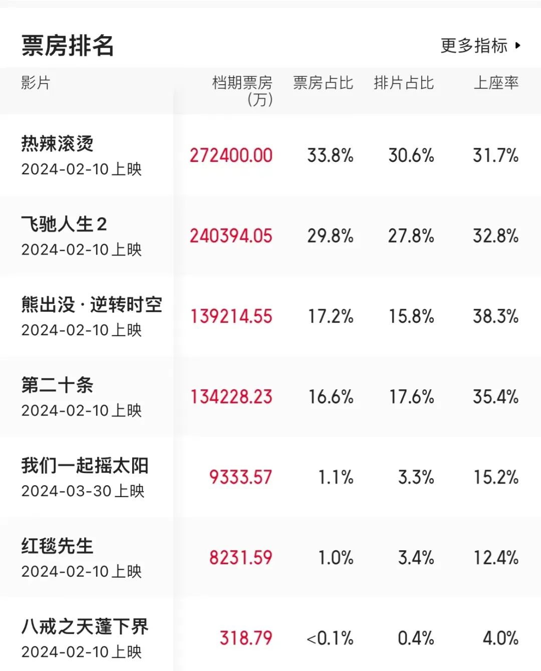 剩下的4部电影里,贾玲的《热辣滚烫》再次交出了一份令市场惊艳的成绩单,以27.23亿票房的成绩领跑春节档。韩寒的《飞驰人生2》紧随其后,囊获24.03亿票房。