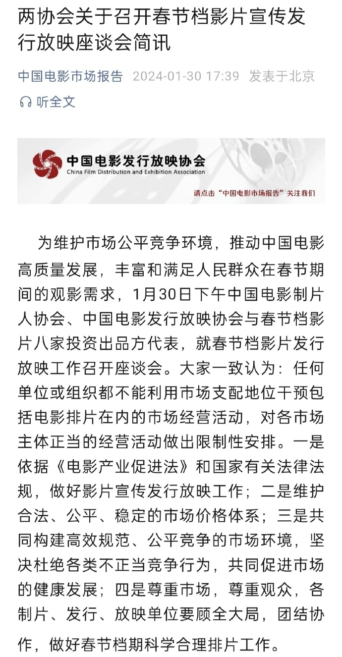 恶性竞争最终引起了业内人士的共同抵制。中国电影制片人协会和中国电影发行放映协会紧急发布简讯,要求春节档期间“任何单位或组织都不能利用市场支配地位干预包括电影排片在内的市场经营活动,对各市场主体正当的经营活动做出限制性安排。”