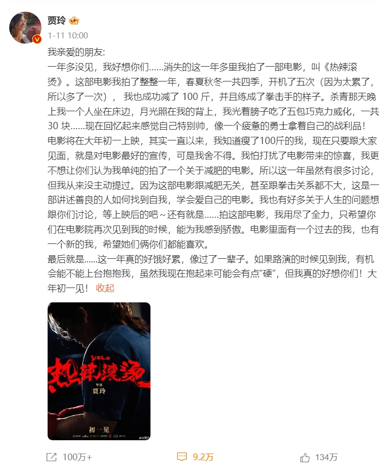 在电影上映之前,贾玲曾发过一条微博和大家问好。行文提到,《热辣滚烫》并非是一部讲述减肥的电影,而是“一部讲述善良的人如何爱找到自我,学会爱自己的电影”。