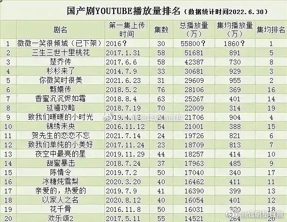 后来,随着国产剧的整体数据水位下降,国外数据其实也在下降。Tik Tok兴起以前,统计国产剧在海外的影响力主要看YouTube。近三年的剧里,只有2021年的《你微笑时很美》挤进了前十。