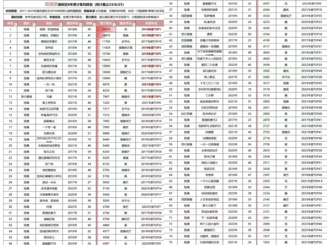但即使这样,圈内人也意识到了偶像剧的问题。2023年的现偶剧,除了《偷偷藏不住》,可谓全军覆没。而冠军《偷偷藏不住》的数据搁在近8年现偶榜单里,仅仅排名36位。