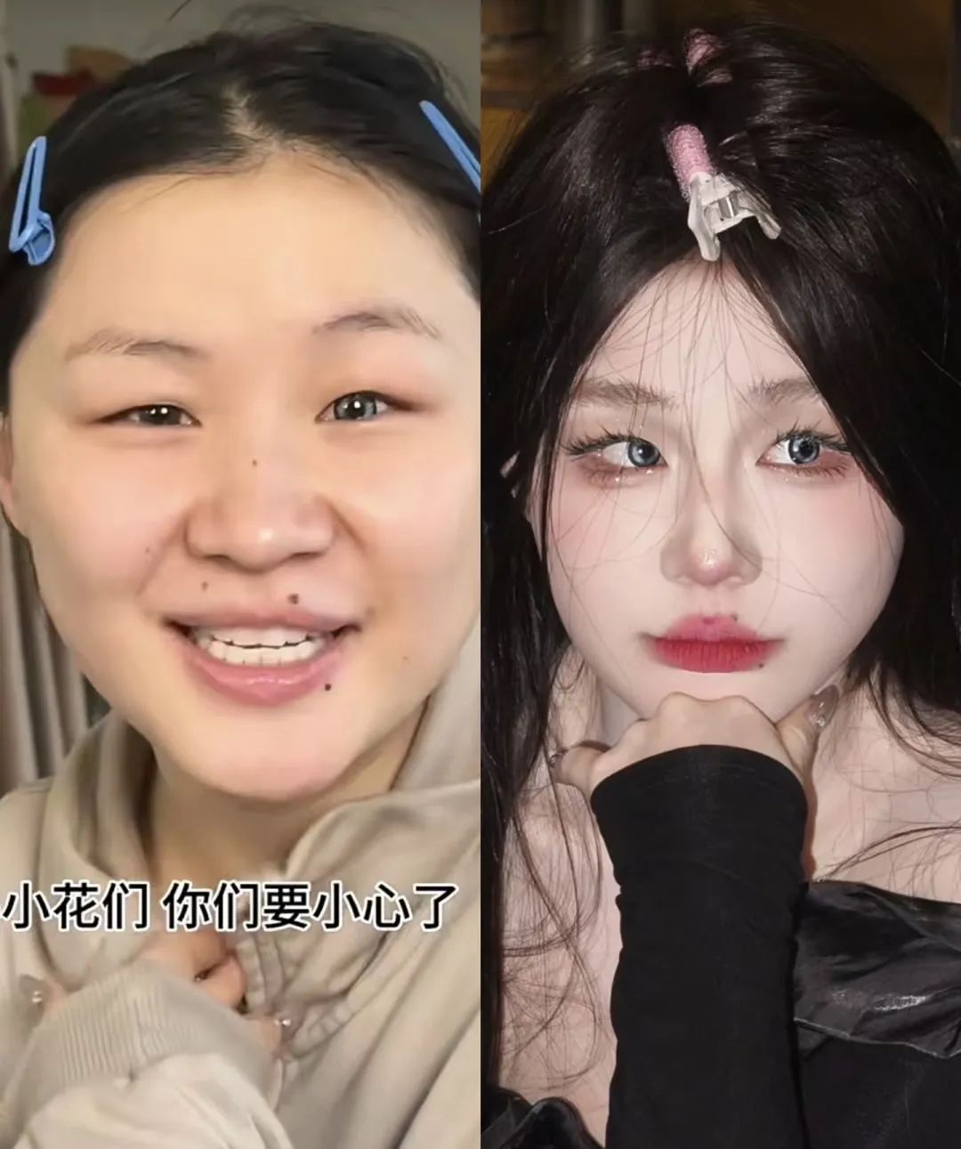 有网友因此总结,“白色底妆+黑色修容+忽闪睫毛+野生眉”正是化妆师兔子爆改的万能公式。
