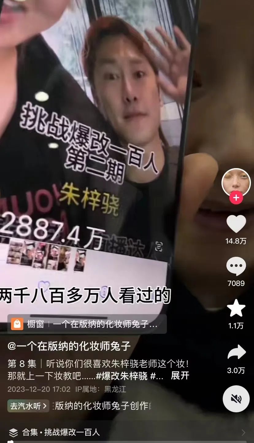 这种无异于徒手捏脸的换头术,吹起了一股名为「爆改」的热潮。爆改这一形式在化妆师@一个在版纳的化妆师兔子(以下简称“化妆师兔子”)发起的#挑战爆改一百人#计划中被熟知,随后,一条爆改朱梓骁的内容率先在短视频平台大火,妆容和造型的完美适配让网友直观地感受到了爆改的魔力。朱梓骁爆改视频大火的五天后,化妆师兔子在短视频中提到,这条视频播放量高达两千八百多万。