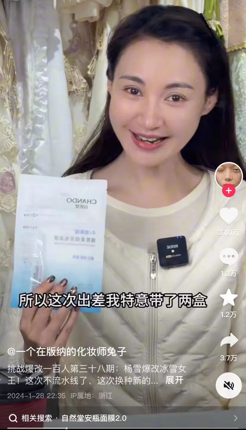明星还会以品牌推广、种草的角色参与爆改。爆改杨雪一期视频中,杨雪在上妆前专门提及自然堂安瓶面膜,并亲自试用,强调产品补水、保湿的功效。