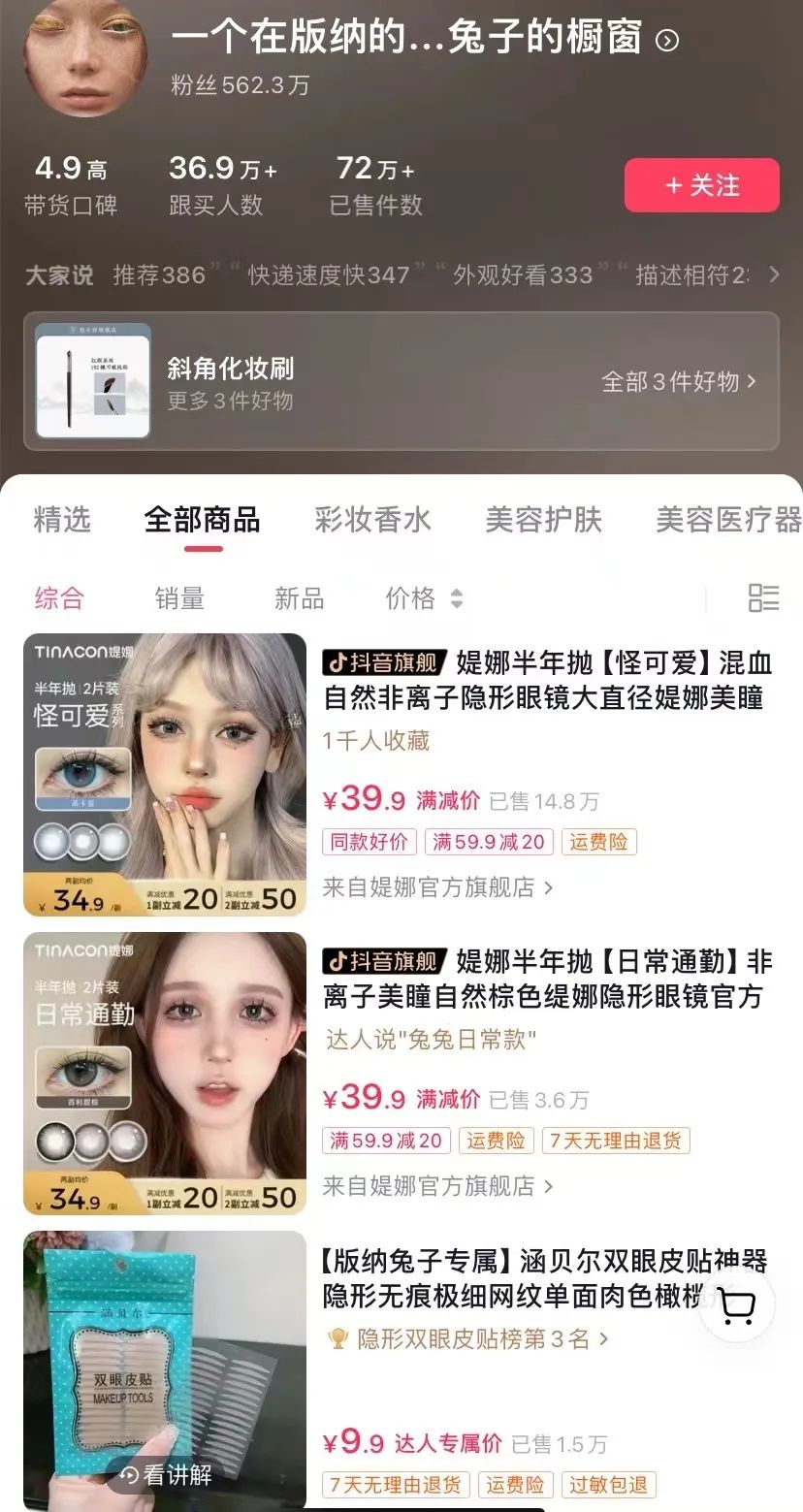 剁椒观察到,彩棠、自然堂、花西子等品牌产品都曾在化妆师兔子的视频中露出。在其抖音账号的商品橱窗中,还上架了彩妆、护肤、美容医疗器械等各类产品,售出超72万件商品,足以证明其带货能力不容小觑。