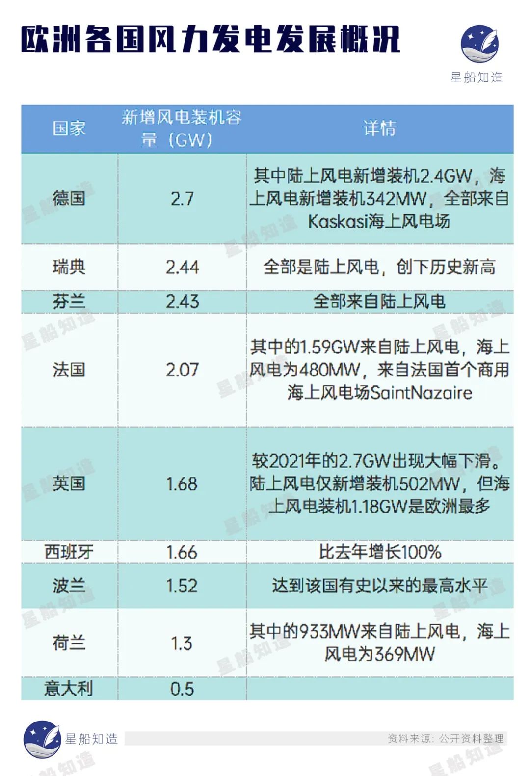 2023年4月欧洲风能协会(WindEurope)发布的《欧洲风能:2022年统计与2023―2027年展望》(Wind energy in Europe:2022 Statistics and the outlook for 2023-2027)报告显示,2022年欧洲风电新增装机容量仅为19.2GW,增长4%,其中陆上风电为16.7GW,海上风电为2.5GW。这一装机规模比WindEurope此前的预测低了12%,也与为实现欧洲气候和能源目标所需的装机水平存在很大差距。