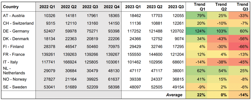 欧洲热泵协会(EHPA)最新数据显示, 2023年前两个季度热泵销量仍然迅猛,但自第三季度开始热泵在欧洲的销量出现下滑。唯一一个2023年销量持续比2022年高的国家是德国