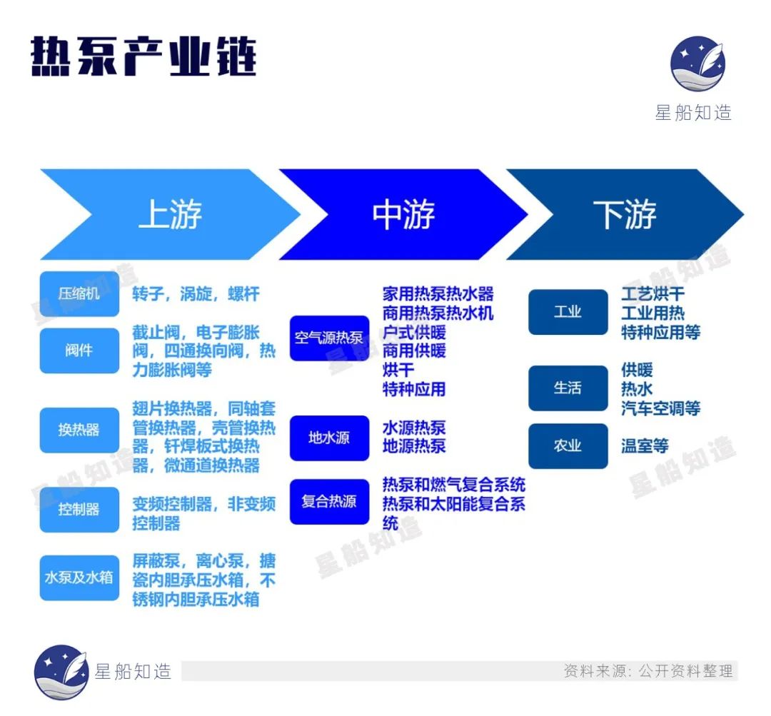 热泵上游牵涉到较多零部件,如压缩机、阀件、热交换器、控制器、水泵(屏蔽泵、 离心泵、循环泵)等——和我们日常用的空调所需零部件高度重合。