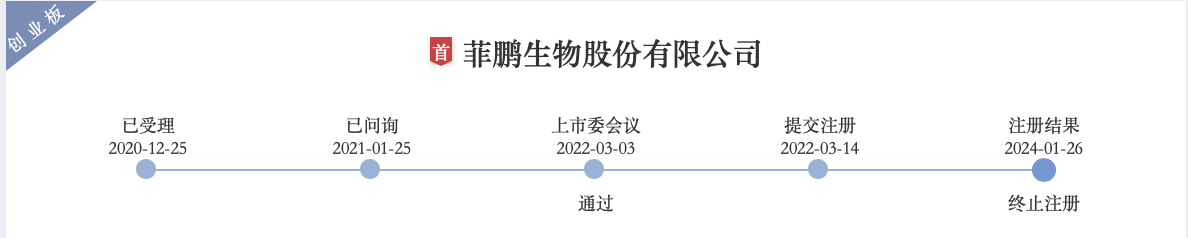 回顾菲鹏生物的申报历程,公司于2020年12月25日获得深交所受理,随后耗时一年多经历三轮问询,于2022年3月3日成功过会,紧接着14日便向证监会提交注册申请,但近两年的时间等来的结果却是终止注册。