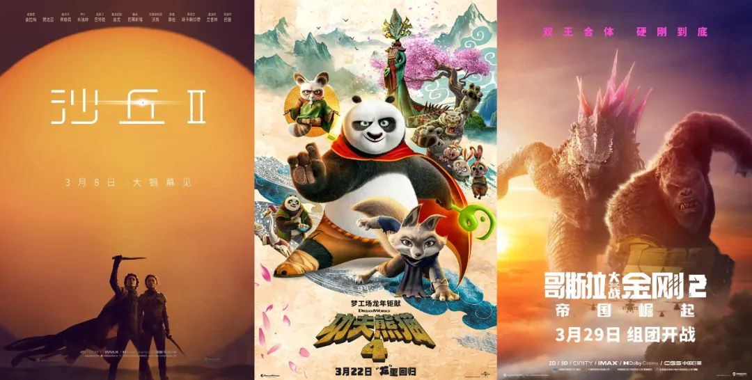而这个历年中所谓的低潮期3月份,往往都是由一些好莱坞分账片来支撑,利用它们的体量优势来作为过渡,今年也不例外,相继有着《沙丘2》、《功夫熊猫4》以及《哥斯拉大战金刚2》来领衔。春节档中国产片已经开了个不错的好头,那么好莱坞大片能否迎来一波翻盘呢?