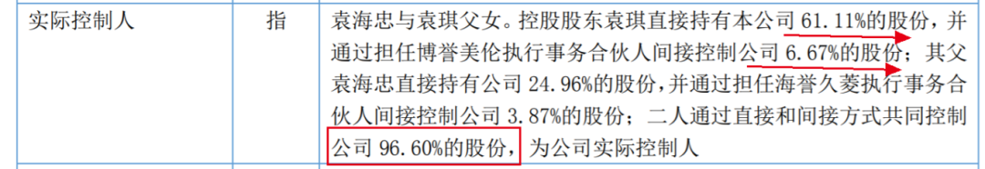 截至2023年上半年末,袁海忠、袁琪父女合计控制公司96.60%股权,为公司实际控制人。其中,袁琪控制公司近70%股权。