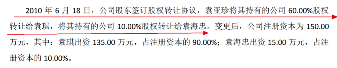 但公司在成立之初,袁海忠并未露面,而是由姐姐袁亚珍出面代持。招股书显示,博菱电器前身博菱有限系由袁亚珍、袁琪于2007年共同设立,注册资本150万元。其中,袁亚珍、袁琪分别持股70%、30%。