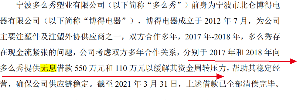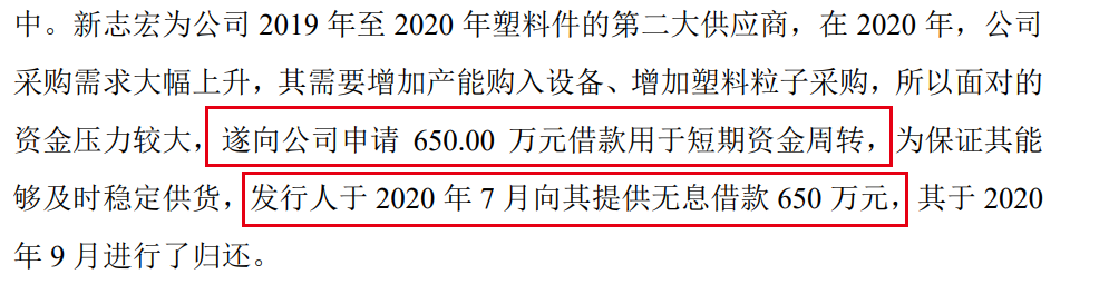 2020年7月,公司向新志宏电器提供无息借款650万元,而新志宏电器为公司2019年至2020年塑料件的第二大供应商。