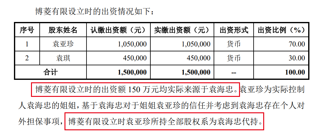 博菱电器坦承,博菱有限成立时的150万元皆是由袁海忠出资,袁亚珍是为袁海忠代持。