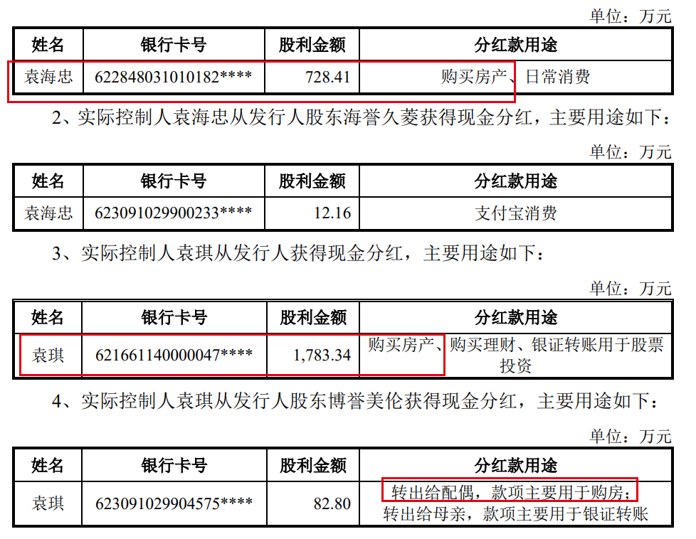 获得分红之后,袁氏父女拿着资金去购房或理财消费。招股书显示,袁海忠将728.41万元用来购房、日常消费;袁琪将1783.34万元用来购房、购买理财、股票投资。除此之外,袁琪还将部分分红款转予配偶用于购房。