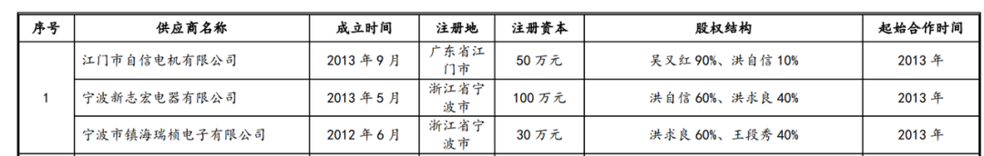 不仅如此,还有不少供应商在成立短时间内便搭上了博菱电器。据「创业最前线」不完全统计,江门自信、新志宏电器、祥成塑业、恒琦五金等供应商均是自成立当年,便与博菱电器进行合作。