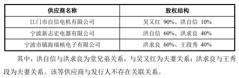 值得注意的是,江门自信、新志宏电器、镇海瑞桢本身就是一组关联公司,在三家企业的股东中,吴又红、洪自信为夫妻,洪自信与洪求良为堂兄弟,洪求良与王段秀为夫妻关系。