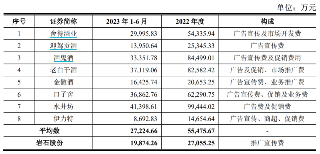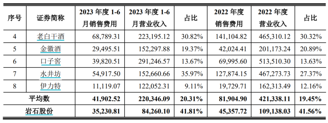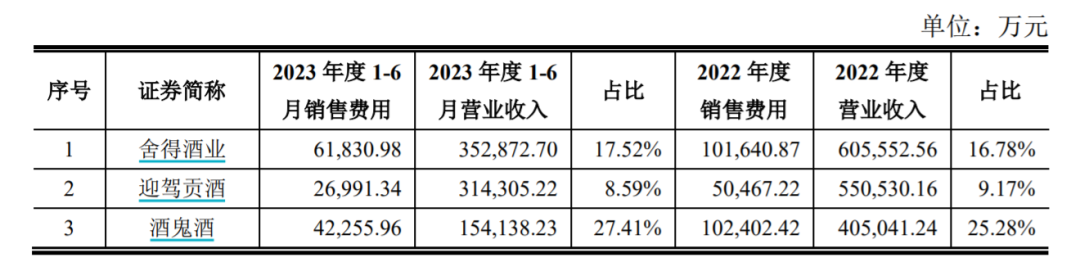 对此,上海贵酒列举了2023年上半年度营业收入规模在10亿元以上至40亿元左右的舍得酒业、迎驾贡酒、酒鬼酒等八家企业,用其销售费用平均数4.19亿元与公司的3.52亿元相对比。