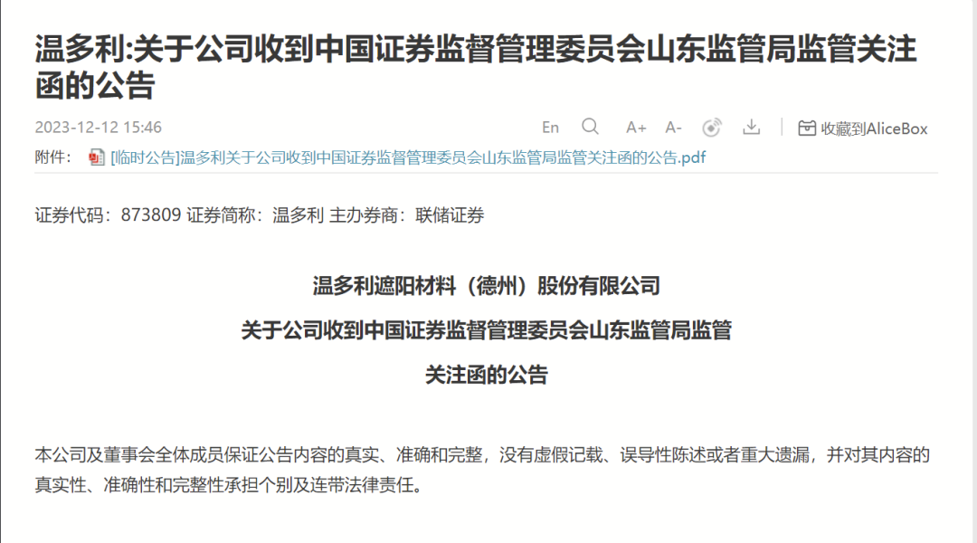 2023年12月11日,温多利因涉嫌违规违法收到监管局的关注函。涉嫌违规违法的事实为治理不规范、财务核算不规范等。