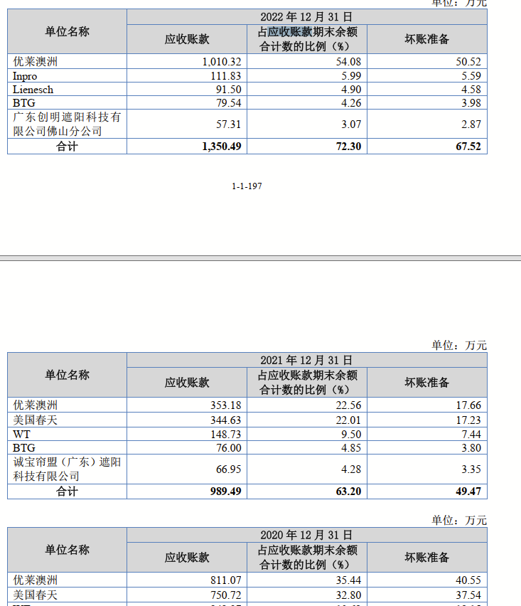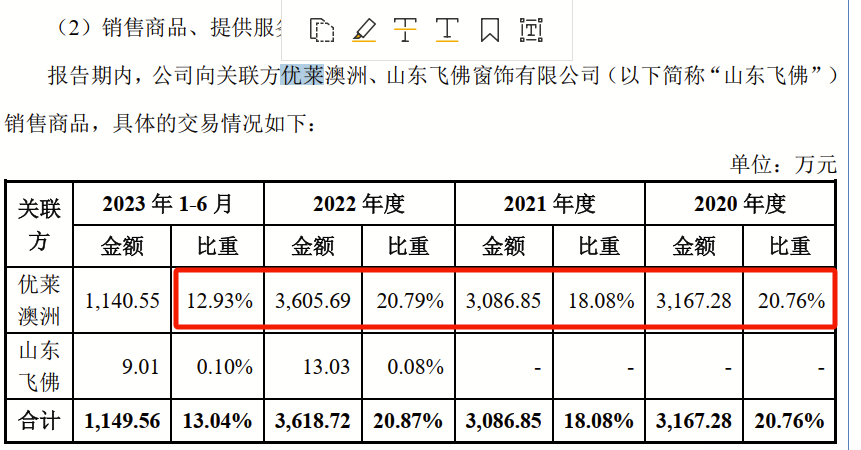 这家优莱澳洲,是温多利的第二大客户,从温多利采购遮阳面料在澳大利亚、新西兰市场销售。《招股书》显示,2020年-2022年,公司对优莱澳洲的销售收入分别为3167.28万元、3086.85万元和3605.69万元,销售占比分别为20.76%、18.08%和20.79%。