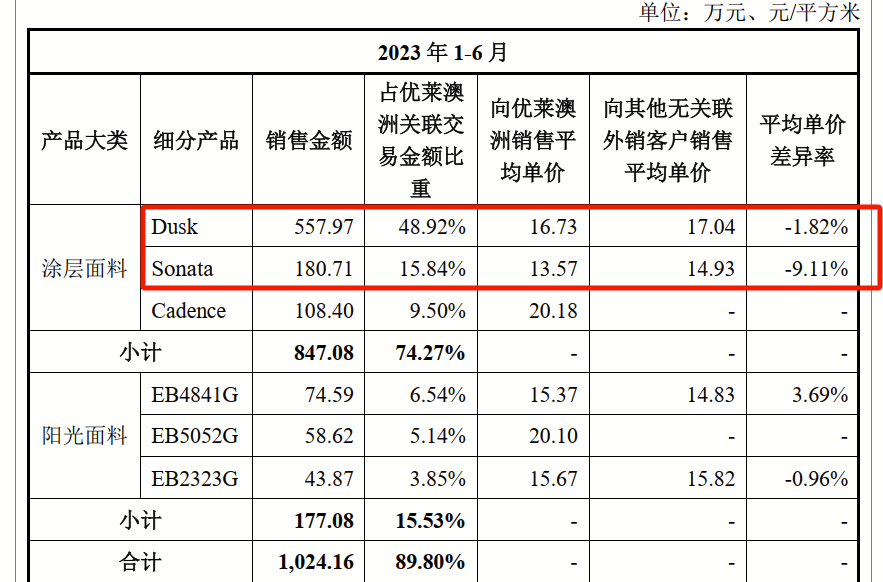 值得一提的是,除了远超其他客户的应收账款,温多利向优莱澳洲销售的涂层面料 Dusk、Sonata 等产品,销售单价相对也较低,分别为16.73元/平方米、14.93元/平方米,低于其他无关联外销客户的销售单价17.04元/平方米、14.93元/平方米。