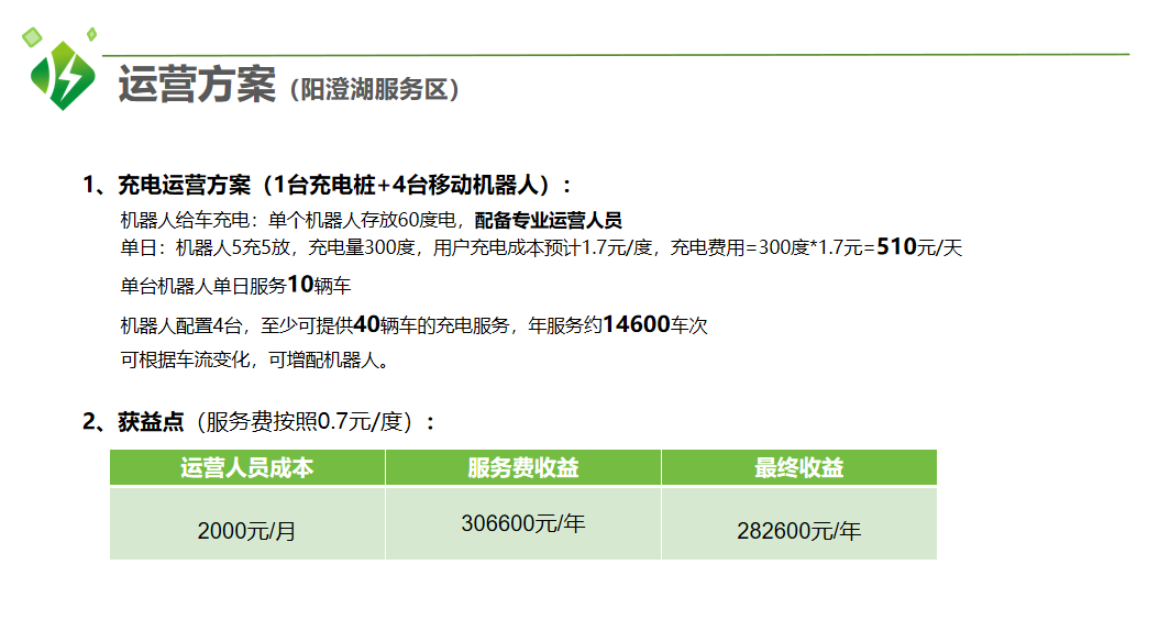 或是为了验证移动充电桩背后的高收益,销售人员刘蓓提供了一份在阳澄湖服务区运营移动充电桩后收益28万元的个人案例,并声称“实现每天300度的充电量基础上,移动充电桩能够在一到两年回本。”