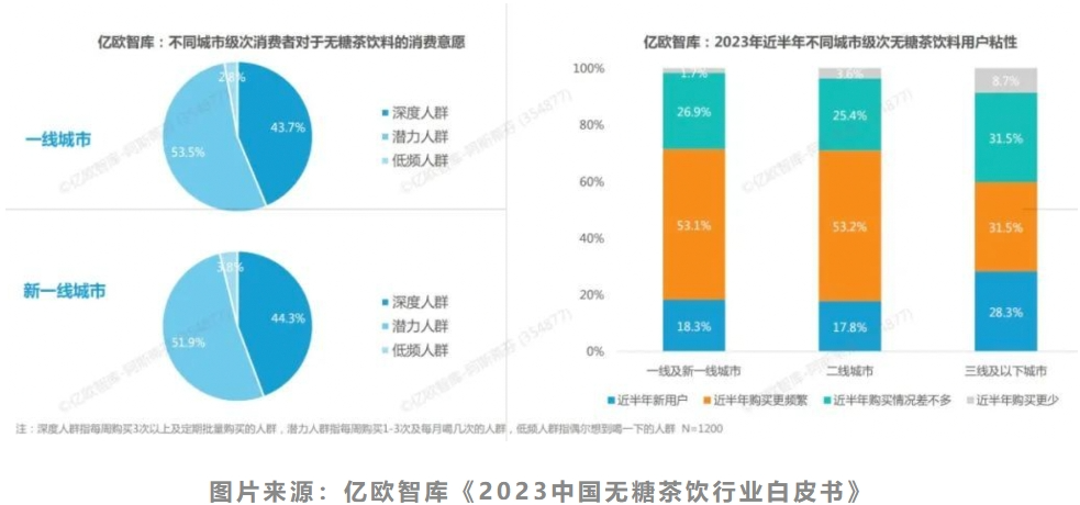 根据亿欧智库《2023中国无糖茶饮行业白皮书》,相较于二线、三线及以下城市,北上广深等一线及新一线城市的消费者对无糖茶饮表现出更多的青睐。在一线和新一线城市中,近半数消费者已经是无糖茶饮的深度人群,且近半年中有超过50%的消费者购买频次增加。但在三线及以下城市,只有三成左右的消费者在半年内购买频次增加,且半年内新用户和近半年内购买更少的用户都明显多于一二线城市。从年龄分布来看,30岁以下人群占比超过七成,总的来说,目前,一二线城市的年轻人是无糖茶饮的主要消费人群。