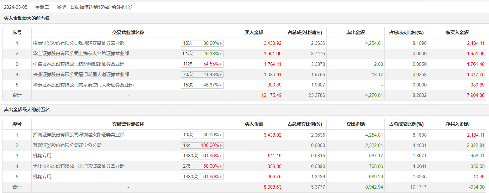 具体来看,机构买入1210.91万元,卖出1656.46万元,合计净卖出445.55万元。此外,招商证券深圳建安路证券营业部、华宝证券上海东大名路证券营业部分别买入6438.92万元、1951.66万元;招商证券深圳建安路证券营业部、万联证券辽宁分公司分别卖出4254.81万元、2322.81万元。