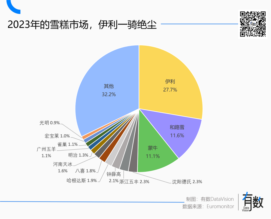 据欧睿数据,截至2022年,中国冰淇淋市场份额超过2%的单一品牌只有7个,伊利以27.7%的份额位居榜首,联合利华(和路雪)、雀巢紧随其后,分别为11.6%、11.1%。