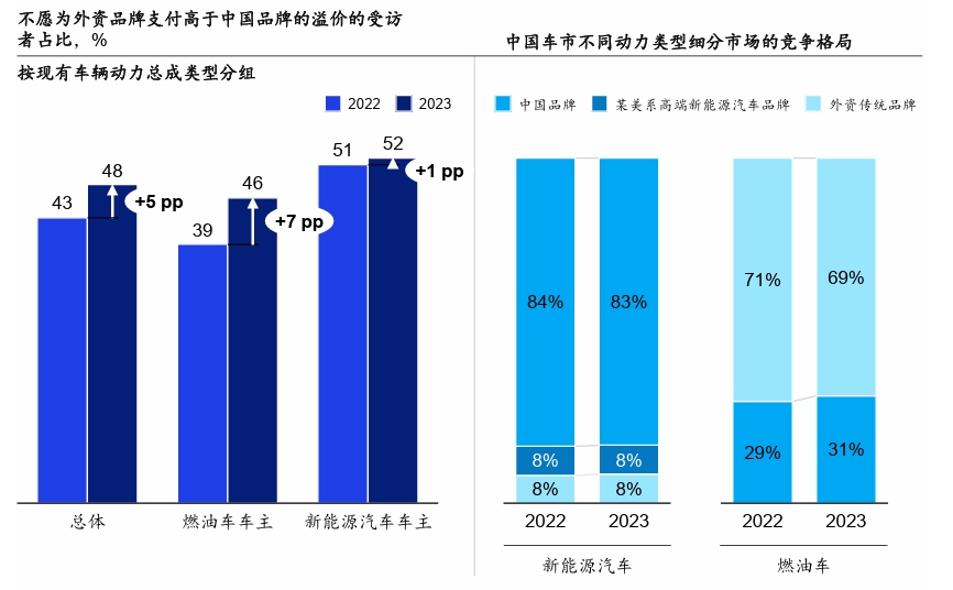 与此同时,外资品牌在中国市场的品牌溢价能力正在逐渐消失。麦肯锡数据显示,48%的受访者表示不愿意为外资品牌支付溢价,高于去年调研的43%。即便是愿意支付溢价的消费者,也仅有3%的相关受访者能够接受高于中国高端品牌售价20%的溢价。