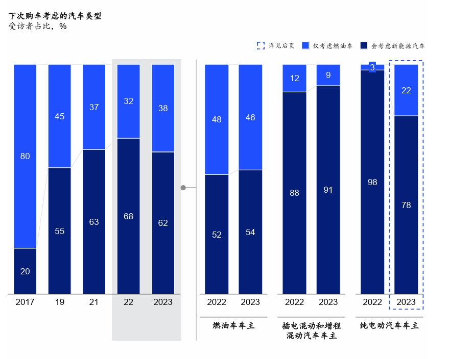 不过,麦肯锡报告发现,中国消费者对新能源汽车接受度首次出现下滑,即下辆车考虑购买新能源汽车的受访者比例,下滑了了6个百分点。其中,有22%的纯电动汽车车主表示下一辆车将不再考虑新能源汽车,而该比例在之前的调研仅为3%。
