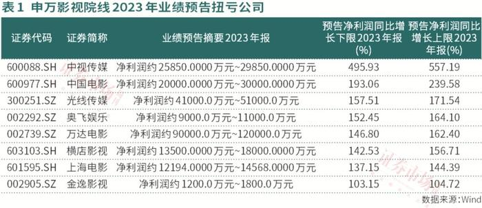 公司方面,已有横店影视、万达电影、光线传媒、上海电影、中国电影、金逸影视等多家影视行业上市公司披露2023年业绩扭亏为盈,或预计扭亏为盈。据不完全统计,扭亏大致达到半数,幸福蓝海、华谊兄弟减亏,唐德影视降利,北京文化、博纳影业、文投控股增亏。