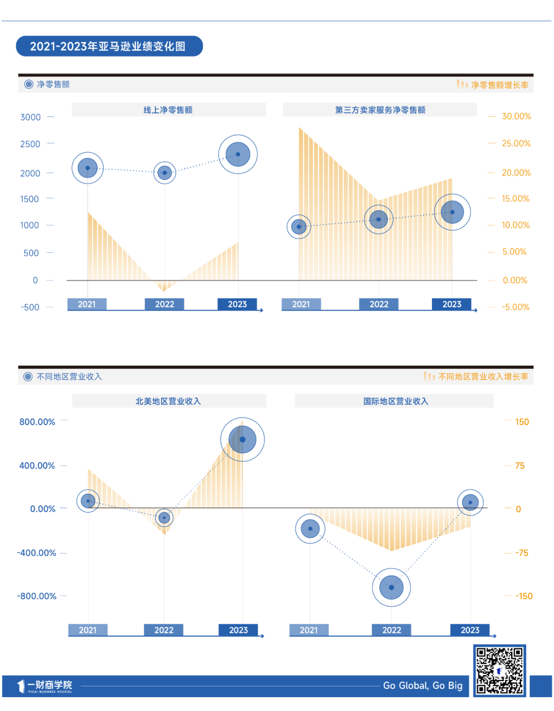 2022年亚马逊业绩表现大幅下滑,不仅线上净零售额减少,北美和国际地区营收甚至为负,市值缩水一半,亚马逊也因此大幅度裁员。但是2023年经过上述一系列调整,亚马逊业绩迅速重回增长。
