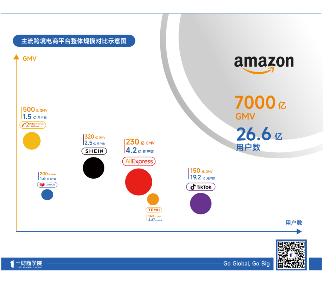 七个主流跨境电商平台2023年GMV与用户规模对比示意图,一财商学院根据官方披露数据、媒体公开报道和对平台过往业绩的估算综合绘制