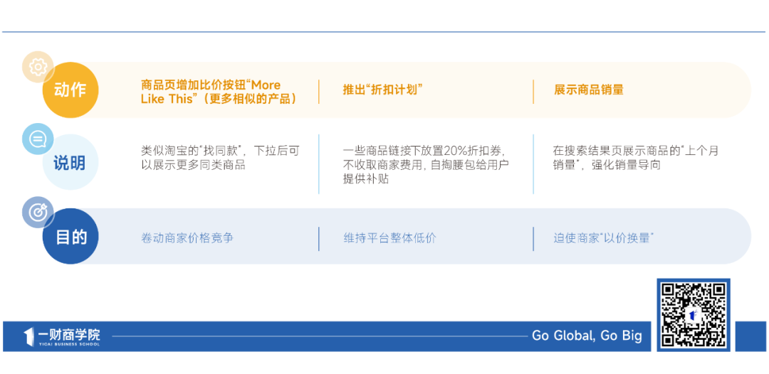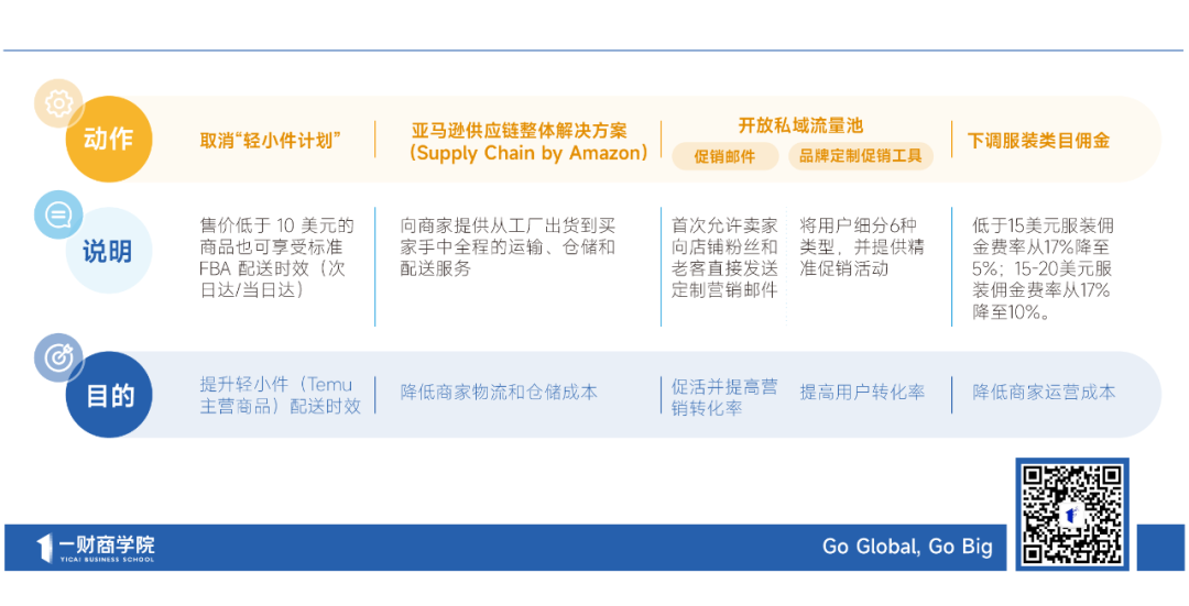 亚马逊的应对之策是不关注对手,提高自身护城河。一财商学院梳理了2023年亚马逊的政策变化,发现亚马逊6年来第一次没有开辟新站点,而是将关注度转向内部,从用户体验、商家运营和行业生态方面做出一系列防御,许多“活久见”的措施令不少商家感到意外:
