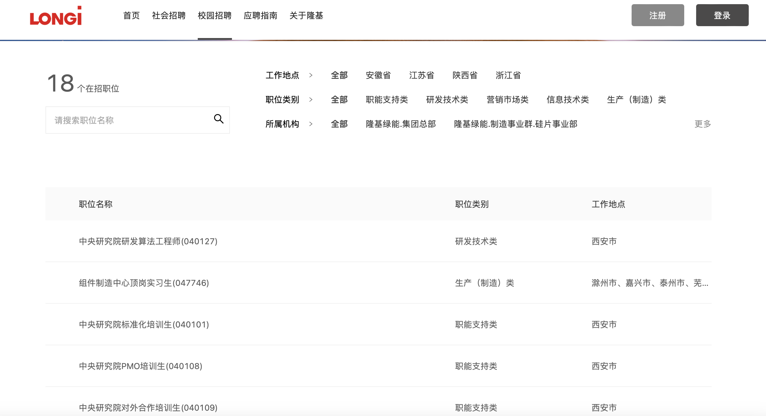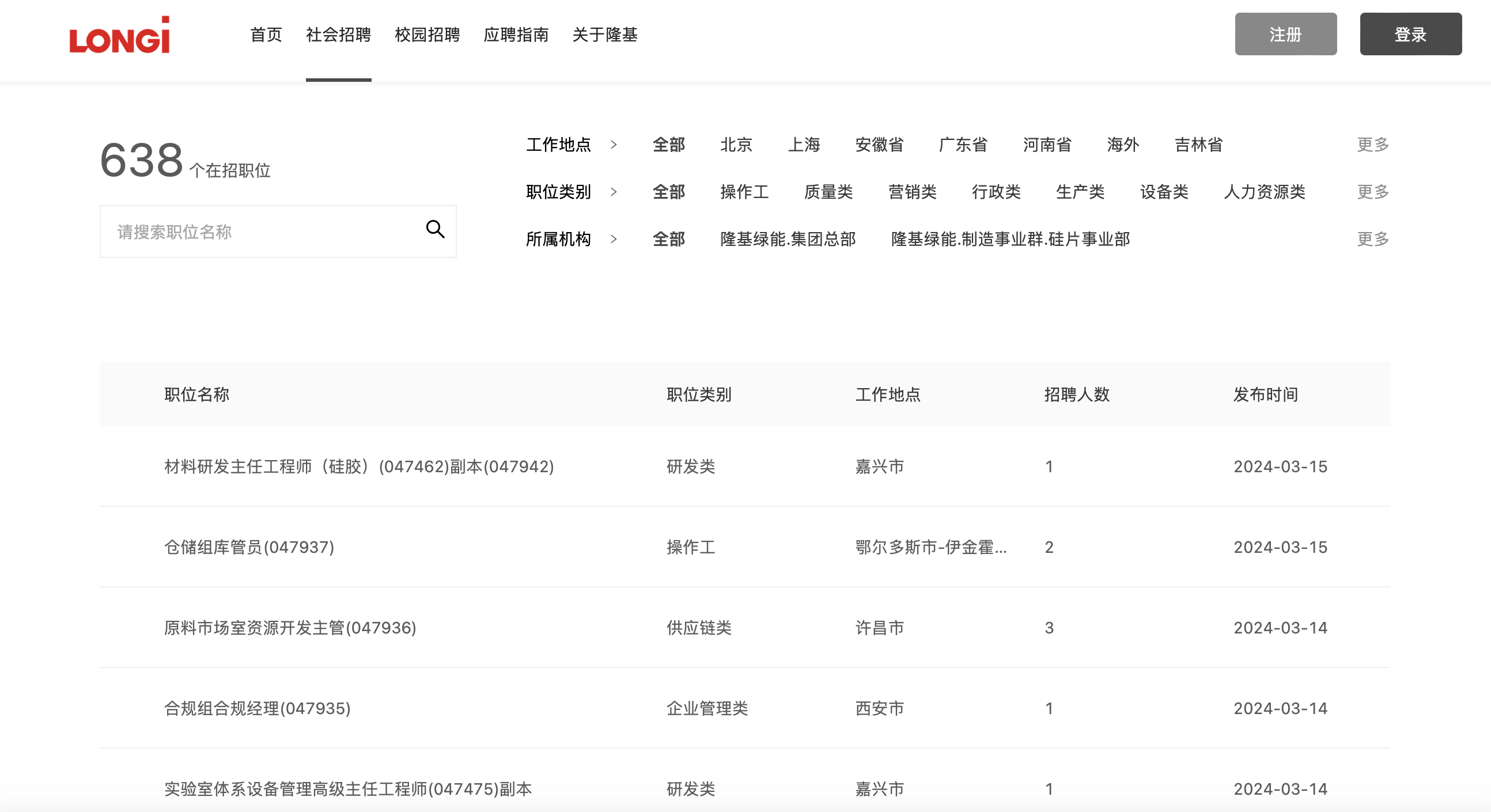 隆基绿能官网上,共有18个校招岗位,集中在中央研究院工程师或者培训生的职位;社招多为3月新发布的讯息,共有638个在招职位,包括材料部研发主任工程师、仓储组库管员等。
