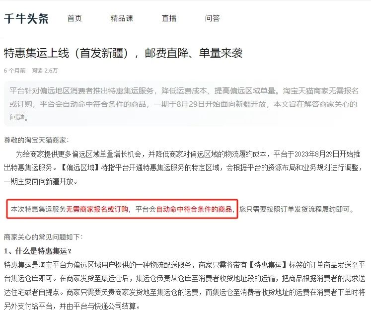以淘宝为例,其推出的特惠集运服务,无需商家报名或订购,而是平台自动命中的。