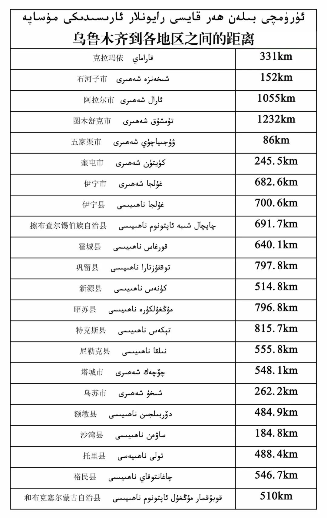 乌鲁木齐到新疆各地区的距离 图片来源:微乌鲁木齐