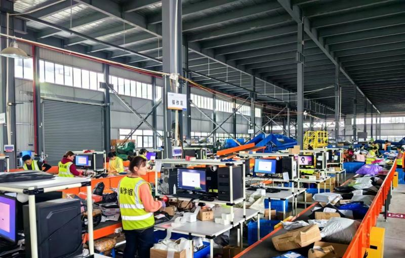 淘宝平台发新疆快递集运仓工作人员正在对新疆路向邮件进行集包封发