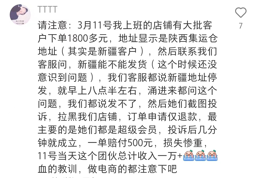 更有甚者,利用现在电商平台的“仅退款”规则,恶意投诉,让商家损失惨重。