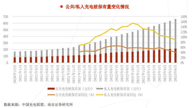 以2023年为例,在新增的充电桩中,私人充电桩的规模远比公用充电桩大,前者约是后者的2.6倍。而私人充电桩是随车配建的,也就是说,新增充电桩的车桩比虽然已经接近1:1,但其中有七成多是私人充电桩,不对外开放。