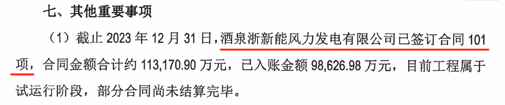 该报告第七部分其他重要事项中又显示,截止2023年12月31日,酒泉浙新能已签订合同为101项,合同金额合计约11.32亿元,已入账金额9.86亿元,目前工程属于试运行阶段,部分合同尚未结算完毕。