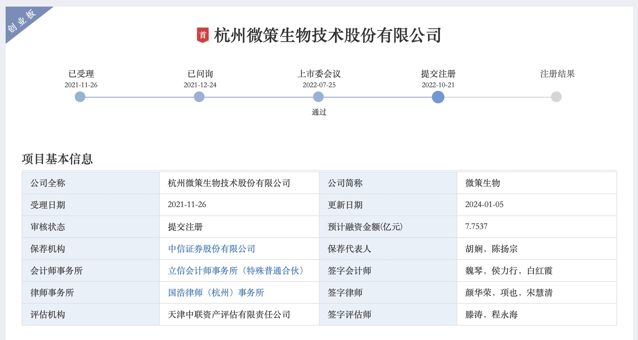 早在2021年11月,杭州微策生物技术股份有限公司(简称“微策生物”)便向创业板递交上市招股书,从问询到上会到提交注册,公司的审核进程非常顺利,但之后却“一动不动”。微策生物证券部门相关人士向界面新闻表示,“目前公司IPO正常进行中,等待证监会的结果。”
