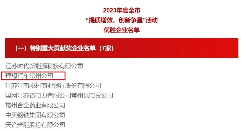 理想汽车荣获2023年度常州特别重大贡献奖企业