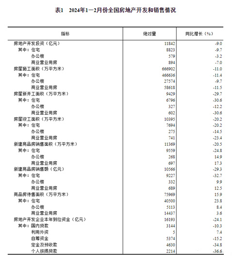 今年1-2月份,新建商品房销售面积11369万平方米,同比下降20.5%,其中住宅销售面积下降24.8%。新建商品房销售额10566亿元,下降29.3%,其中住宅销售额下降32.7%。